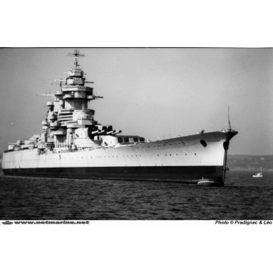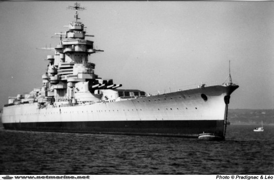Achevé à 95% en 1939, le Richelieu est encore en essais lors de l'invasion allemande de 1940. Il quitte Brest le 18 juin, juste avant l'arrivée des allemands, et rallie l'Afrique occidentale française et Dakar, où il essuie plusieurs attaques anglaises et réplique avec ses tourelles de 380 (chaque obus pése une tonne) et met la flotte anglaise en fuite. Il y reste jusqu'en 1943. A cette date, il part vers New York en grand carénage puis participe à la libération de Singapour en septembre 1945, et aux premières opérations d'Indochine à partir d'octobre 1945.