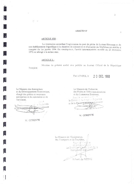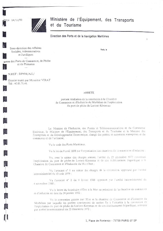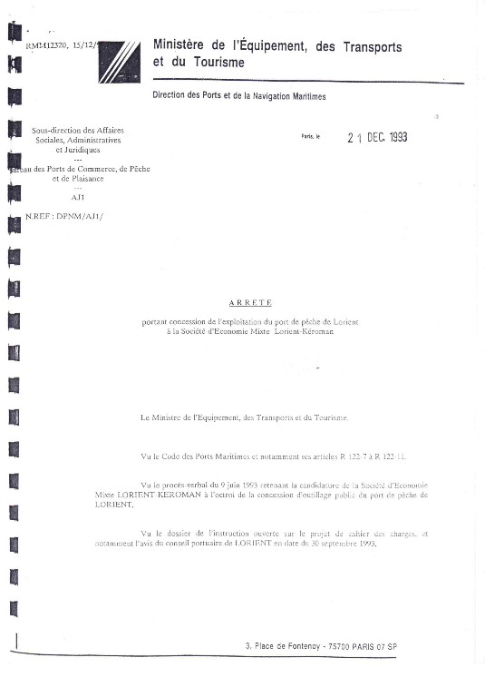 Les documents ci-dessus montrent bien que le transfert de concession entre la CCIM et la SEM KEROMAN a été décidé par arrêté interministériel du 23 décembre 1993 qui d'une part retire la concession à la CCIM le 31 décembre 1993 et l'attribue à la SEM le 1 janvier 1994.
